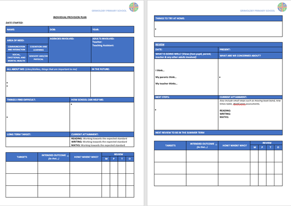At Grimoldby Primary School we use Individual Provision Plans to build information about the child’s strengths and interests. We will always include the latest assessment information. The Individual Provision Plan identifies what the child finds difficult and details what provision is in place for an individual child. This could be provision that is additional to and different from the provision usually available through quality first teaching in the classroom. The Individual Provision Plan also includes individual targets that are set after consultation with the child, parents/carers, the class teacher and occasionally through assessments from The Specialist Teaching Team. These identify the next steps for the individual child. It also includes ideas that parents/carers can use at home to support the child’s learning. Each time the Individual Provision Plan is reviewed the child, parents/carer and any other professionals supporting the child are consulted and their thoughts are recorded on the review page. The pupil profile is reviewed at least 3 times per year.